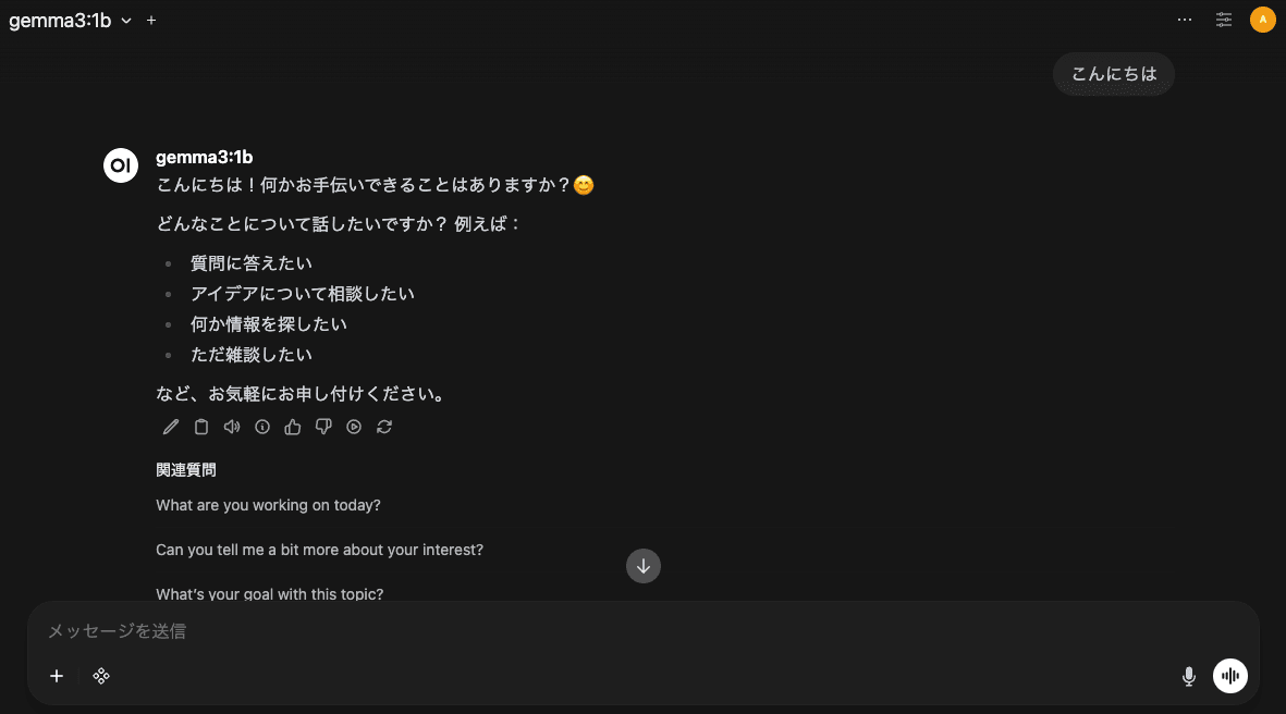 curl http://localhost:11434/v1/chat/completions \ -H "Content-Type: application/json" \ -d '{"model": "gemma3:1b", "messages": [ {"role": "system", "content": "あなたは優秀なアシスタントです。"}, {"role": "user", "content": "こんにちは。"} ] }'